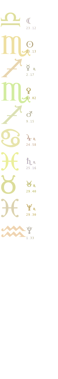 Mon November 17 2025 06:39 SU,Pis,13.04,Squ,JU,Gem,12.23,89.32,90,6.3185603003142 ME,Ari,0.03,Con,NE,Pis,28.58,1.09,0,5.9123745393596 VE,Ari,10.48,Sex,JU,Gem,12.23,61.58,60,4.4220787188407 MO,Ari,29.29,Squ,PL,Aqu,2.52,86.62,90,3.6214418992337 MA,Can,17.21,Tri,SA,Pis,20.59,116.36,120,3.3640980686993 SA,Pis,20.59,Sex,UR,Tau,23.44,62.76,60,3.2438601613208 ME,Ari,0.03,Sex,PL,Aqu,2.52,57.18,60,3.1813024850155 SU,Pis,13.04,Tri,MA,Can,17.21,124.28,120,2.7189127136593 MO,Ari,29.29,SSx,NE,Pis,28.58,30.53,30,2.4722351251414 MO,Ari,29.29,SSx,ME,Ari,0.03,29.44,30,2.4401394142182 NE,Pis,28.58,Sex,PL,Aqu,2.52,56.09,60,2.0936770243751 MO,Ari,29.29,SSq,SU,Pis,13.04,46.42,45,1.5798869277351
