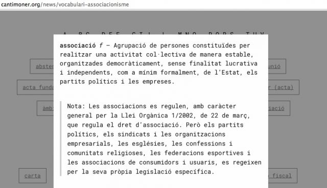 associacióf — Agrupació de persones constituïdes per realitzar una activitat col·lectiva de manera estable, organitzades democràticament, sense finalitat lucrativa i independents, com a mínim formalment, de l’Estat, els partits polítics i les empreses.